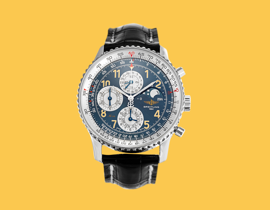 그러한 측면에서 브라이틀링사의 네비 타이머는 가장 상징적인 다이얼 디자인을 가지고 있다. 첫인상은 눈이 아플 정도로 많은 미닛 스케일(눈금)과 숫자들로 어질 하다. 이 시계를 가장 특별하게 만드는 지점은 카운터 세 개가 좌측으로 정렬돼있는 것이다. 이러한 경우 우측의 시각적 무게가 무너지기 쉽다. 그러므로 왼쪽 그룹과 상대적으로 비슷한 무게감을 가진 시각적 요소가 우측에 배치되지 않으면 안 된다. 하지만 네비타이머는 브라이틀링의 화려한 로고와 문페이즈 영역을 활용해 아슬아슬하게 시각적 균형감을 잃지 않았다.