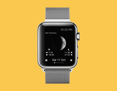 문페이즈 영역 날짜 테두리에는 짝수가 삭제되고, 그 자리에 온점이 배치됐다. 31에서 1로 넘어가는 중간에 온점을 넣으면 시각적 논리가 무너지기 때문에 간격을 과감히 붙여 버렸다. 모든 것이 정밀하게 짜인 기하학적 지면에서, 자칫 실수처럼 느껴지는 이 작은 부분 때문에 설명할 수 없는 매력이 생겨나는 것 같다. 아래 그림은 애플 워치의 문페이즈 기능이다. 기계식 다이얼이 만들어내는 우아한 문페이즈와 다른 매력이 있다. 조금 더 데이터 중심이며 실사에 가깝게 달이 디자인되었다. 기술적 변화에 맞춰 데이터가 변주되는 흥미로운 양상이라고 생각된다.