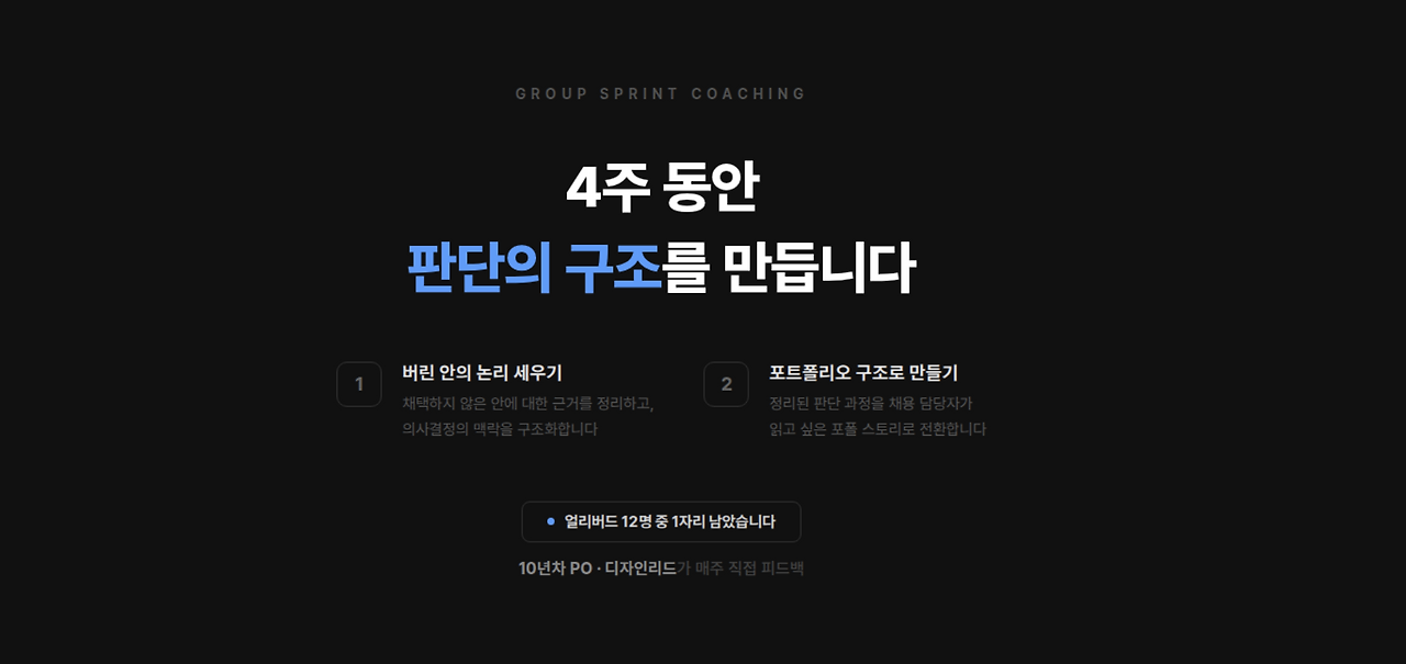 그룹 스프린트에서 4주 동안 두 가지를 같이 합니다. 채택하지 않은 안의 논리를 세우는 것, 그리고 그걸 포트폴리오 구조로 만드는 것. 매주 직접 피드백을 받고 참가 디자이너들과 함께 성장할 수 있습니다. 얼리버드 12명 중 1자리 남았습니다.