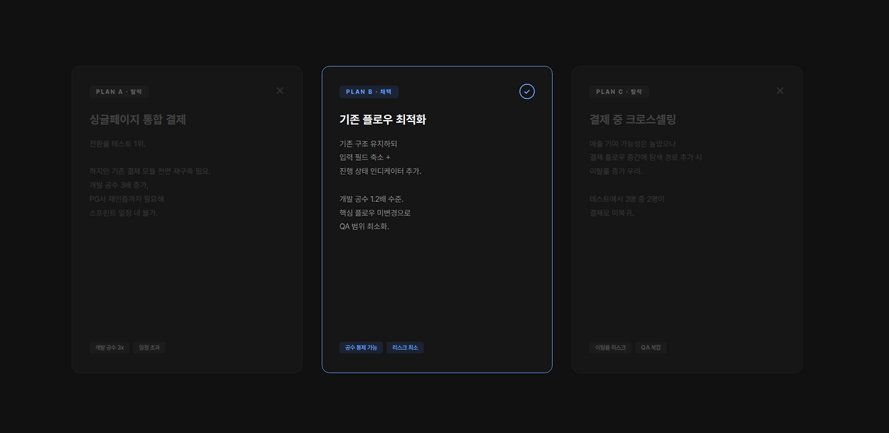 A안은 장바구니와 결제를 하나의 싱글 페이지로 통합하는 방식이었습니다. 사용성 테스트에서 전환율이 가장 높았어요. 하지만 기존 결제 모듈을 전면 재구축해야 해서 개발 공수가 약 3배로 늘어났고, PG사 연동 재인증까지 필요했습니다. 당시 스프린트 일정 안에서는 현실적으로 불가능한 안이었죠.