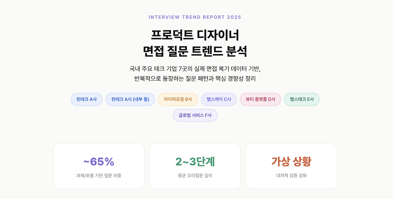 멤버십에 가입하시면 가장 먼저 '2025~2026 프로덕트 디자이너 면접 질문 트렌드 리포트'를 보내드려요. 국내 주요 테크 기업 7곳의 실제 면접 복기 로그로 정리한 자료입니다.