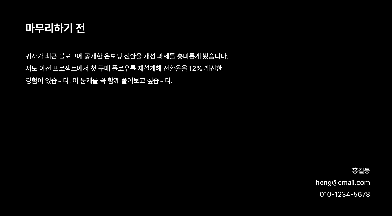 포트폴리오의 첫 페이지가 문을 여는 역할이라면, 마지막 페이지는 문을 닫으며 남기는 인상입니다. 리뷰어가 다음 포트폴리오로 넘어간 뒤에도, 아까 그 사람, 우리 문제를 알고 있었는데라는 기억이 남는다면 그 마지막 페이지는 아주 큰 역할을 한 겁니다.