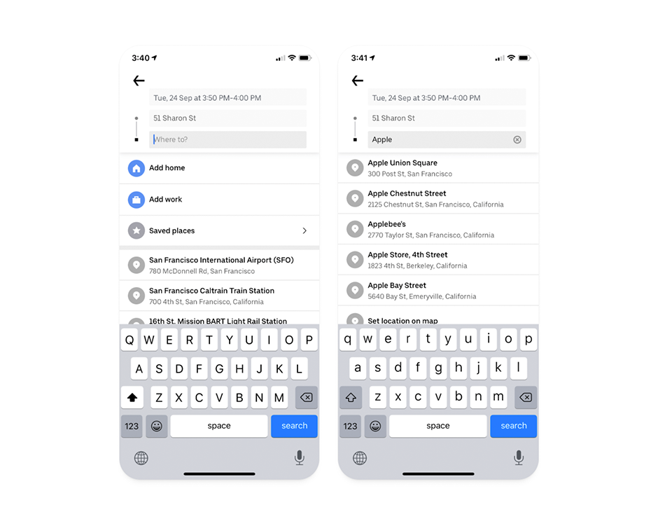아래는 승차 공유 서비스 UBER의 화면 중 하나다. 목적지 입력을 시작하는 동시에 제공되는 각종 자동완성 기능은 입력의 번거로움을 상당 부분 줄여준다. 입력이 불가피하다면 타이핑해야 할 절대적 양을 줄여나가는 방향도 UX적으로 고려할 대상이다.