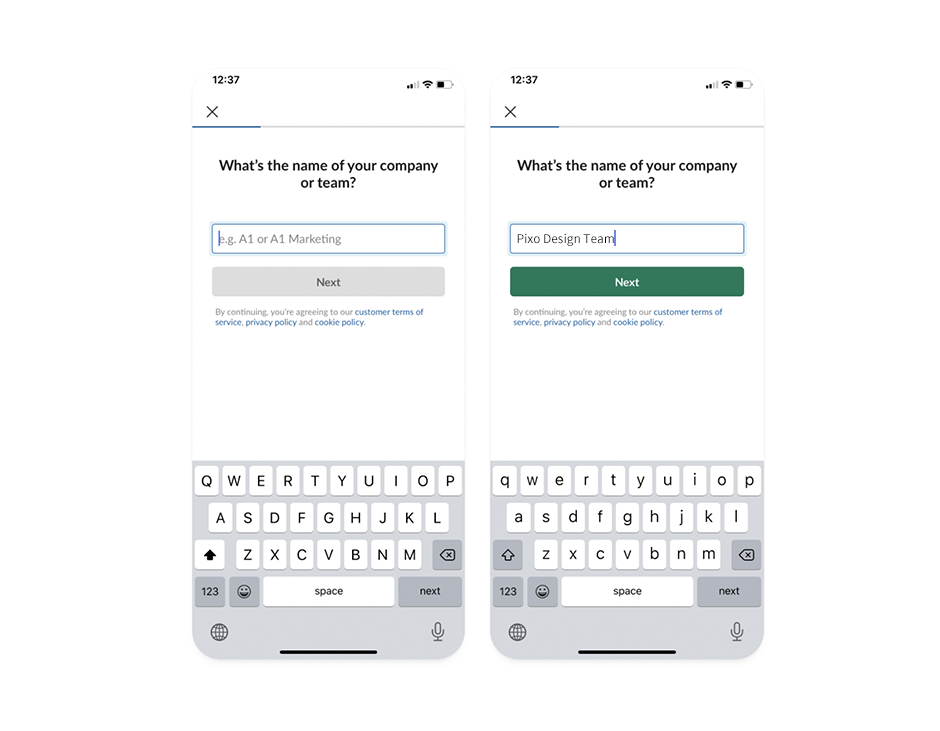 사람들은 질문이 명확하더라도 텅 빈 입력 폼 앞에서 망설이는 경향이 있다. 무의식적으로 답에 맞는 ‘형식’까지 고민하기 때문이다. 잠깐의 머뭇거림은 '생각 비용'을 발생시키고 이탈률에 영향을 미친다. 디자이너는 '힌트 텍스트'를 넣어주는 것으로 사용자의 생각 비용을 상당히 줄일 수 있다. 클라우드 기반 협업 툴인 'Slack'은 회사 이름을 적는 입력 폼에 적절한 힌트 텍스트를 던져줌으로써 사용자의 생각 비용을 줄일 수 있었다.