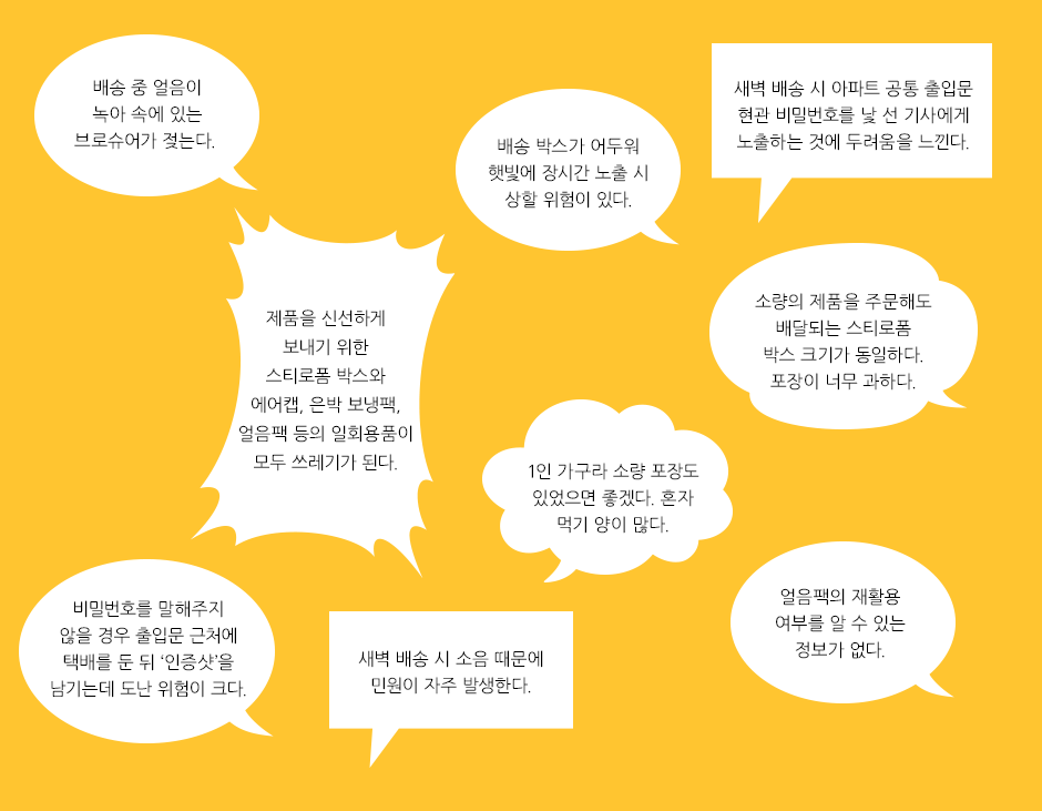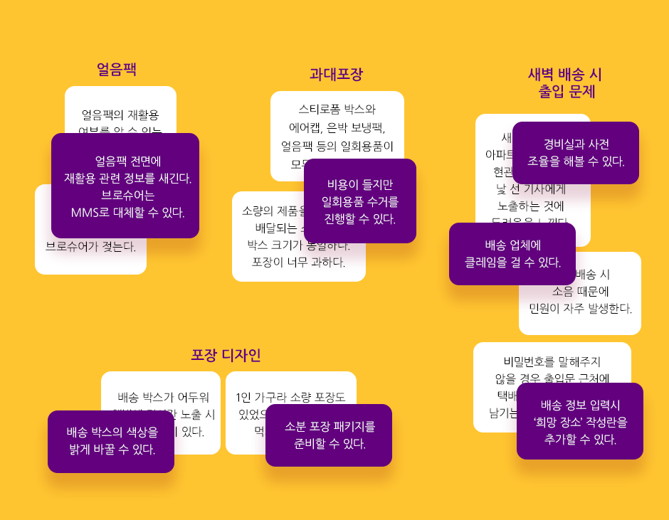 그룹핑된 데이터와 추가 검색으로 모은 데이터를 묶어 현실적 방안들을 브레인스토밍 해보았다. 한 예로 '얼음팩 재활용에 대한 정보 없음'과 '젖는 브로슈어' 두 가지를 엮어 '얼음팩 표면에 정보를 인쇄한다'라는 아이디어를 도출할 수 있었다. 만약 배송 중 젖는 브로슈어만이 문제였다면 종이 재질 검토나 적재 프로세스 개선 같은 생각이 먼저 났을 듯하다.