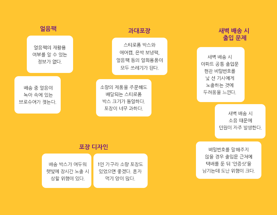 이후 <그림 2>처럼 관련성 높은 데이터끼리 그룹핑해주었다. 자연스레 얼음팩/과대포장/새벽 배송 시 출입 문제/ 포장 디자인 등의 제목이 생겼다. 제목은 키워드화 되어 확장된 검색의 발판을 마련해준다. 추가로 타 브랜드에 대한 자료가 수집되었다.