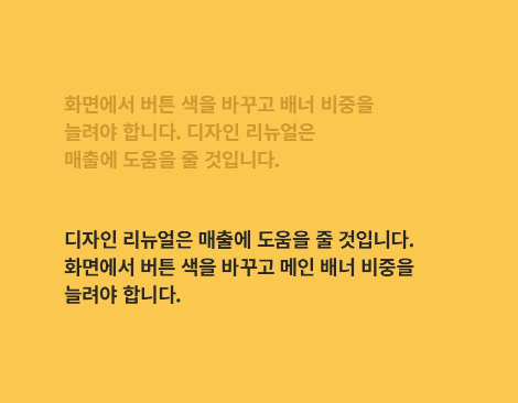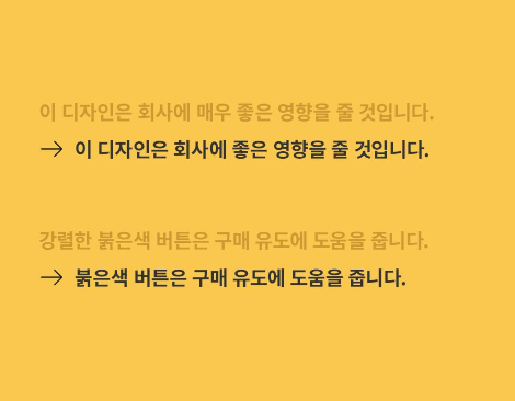 15초 안에 상대를 주목하게끔 하기 위해서는 결론부터 말하는 편이 낫다. 이를 '전결형 화법'이라고 한다. <그림 5>는 동일한 메시지를 담고 있지만 목적(매출)과 과정(리디자인)이 다르게 배치되어있다. 언어에서 초두 효과는 목적을 먼저 내비칠 때 발생한다. 타인의 욕망을 미리 파악해 둔다면 도움이 된다. 체면이 중요한 클라이언트의 우주적 말에 속지 말자. 대부분의 목적은 매출인 경우가 많다.