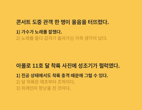 <그림 6>을 보자. 콘서트 도중 한 관객이 울음을 터뜨렸다. 노래는 발라드였고 가수는 그날따라 목 컨디션이 좋았다. 우리가 가질 수 있는 정보는 제한적이다. 내 생각에 노래 가사가 가족을 떠올릴만한 것이었다 해도, 정보가 적을 경우 확실한 쪽으로 판단하는 편이 낫다. 아폴로 11호 달 착륙에 관한 예시도 마찬가지다. 조작이나 외계인은 해석의 여지가 넓다. 이럴 때 오컴의 면도날을 이용해 판단 오류의 가능성을 잘라내야 한다.