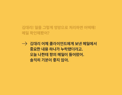 개발자에게 디자인 의도를 설명한다. 회의 중 반대 측을 설득하기 위해 노력한다. 팀원 앞에서 프레젠테이션을 하고, 대표에게 결과를 보고 한다. 회사 동료와 커피를 마시며 일상적 대화를 나눈다. 정보 전달을 위해 직접 누군가를 찾거나 메신저를 사용한다. 호흡이 긴 말은 메일로 대체한다. 당사자가 없을 때는 책상 위 쪽지를 남겨둔다. 이처럼 디자이너의 일상은 다양한 커뮤니케이션의 연속이다. 좋은 하루를 보내기 위해 디자이너의 말 그릇은 어떤 재료들로 채워져야 할까?