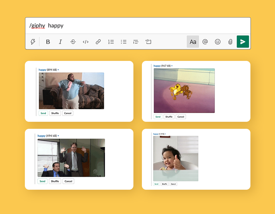 내가 재직 중인 회사의 사내 메신저는 슬랙이다. GIPHY API를 연동해 채팅창에서 바로 사용이 가능하다. "/giphy + 단어"를 입력하고 'Send'를 누르면 랜덤 루핑 애니메이션이 호출된다. 만약 결과가 마음에 들지 않으면 셔플을 눌러 새로운 애니메이션을 계속 호출할 수 있다. <그림 2>는 'happy' 검색 후 셔플로 연속해 얻은 애니메이션들이다. 지피가 셔플을 통해 주는 예측 불가능함은 뇌의 보상 시스템을 활성화시킨다. 시스템에 계속 불이 켜지기 위해서는 애니메이션이 계속 공급될 거란 '기대감' 자체가 중요하다. 주스 맛보다 벨소리에 도파민 수치가 급격히 상승한 원숭이의 작용원리와 비슷하다.