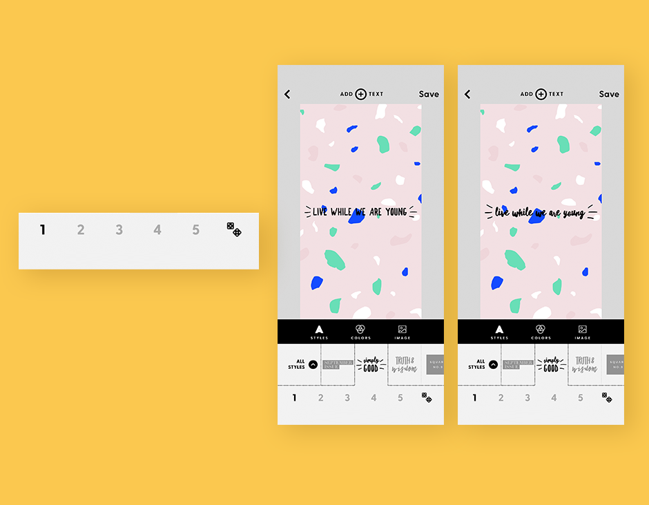 <그림 4는> 워드 스웨그의 에디트 화면이다. 하단을 보면 숫자(1-5) 우측에 주사위 아이콘이 있다. 주사위를 누르면 지피처럼 미리 선택된 폰트 대신 섬광과 함께 새로운 폰트를 호출시킨다. 사용자가 시간을 들여 작성한 문장이 클릭 몇 번으로 변형되어가는 모습은 기대감을 일으키기에 충분하다.