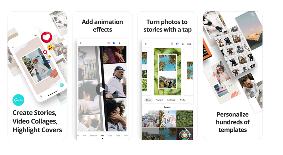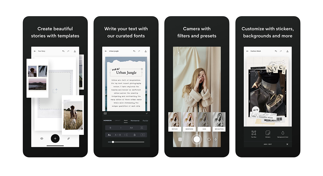 ‘Canva Stories’는 ‘Canva’라는 그래픽 디자인 플랫폼에서 파생된 서비스다. Canva는 비 디자이너를 위한 소셜 미디어 그래픽, 프레젠테이션, 포스터 같은 시각 콘텐츠를 쉽게 만들 수 있도록 하는 서비스다. 반면 Canva Stories는 스토리 에디트에만 집중한다. 참고로 Canva는 그래픽 디자인 플랫폼 시장에서 가장 규모가 큰 서비스 중 하나다. Unfold가 미니멀한 톤 앤 매너에 집중하고 있다면 Canva Stories는 더 대중친화적이라고 할 수 있다. 700개가 넘는 방대한 템플릿을 제공하고 있으며, 2주마다 새로운 템플릿을 추가한다는 미션을 가지고 있다. 상대적으로 무료 템플릿을 많이 제공하는 것도 특징 중 하나다.