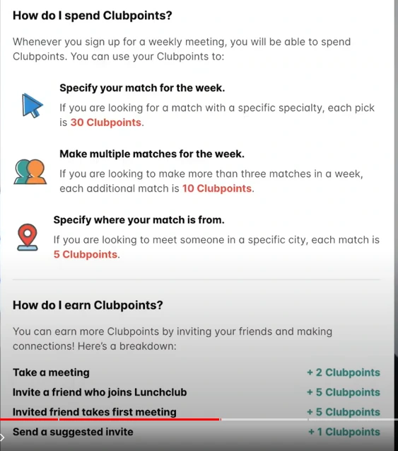 친구를 초대하거나, 미팅 진행등을 통해 포인트를 모을 수 있으며, 몇몇 프리미엄 기능 ex) 주 3회 이상 미팅, 특정 specialty를 가진 대상과의 미팅중개, 특정 지역한정 할 경우 추가 point를 지급해야함.