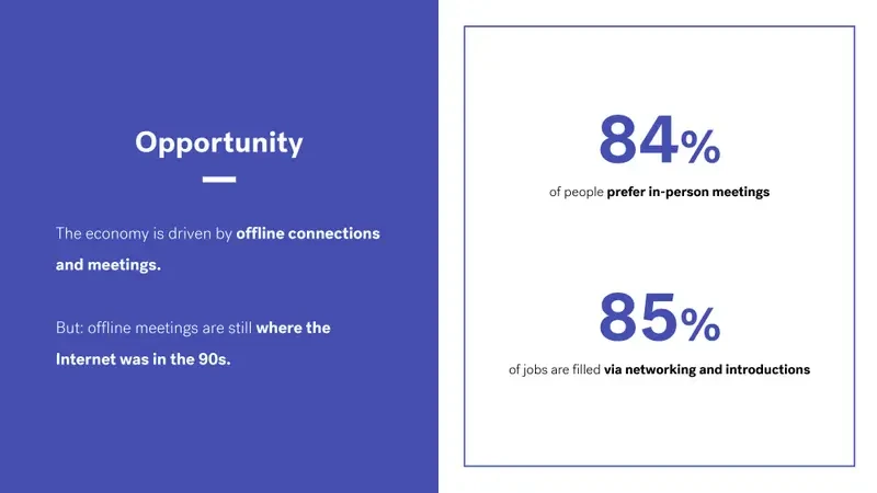 초기에는 오프라인으로 만나는 것을 주선했으나, 코로나 시기 오프라인 네트워킹이 어려워지며 판데믹 이후 온라인으로 만나도록 전환하였고 미팅 건 10배 성장함.(매주 수만건 수준)