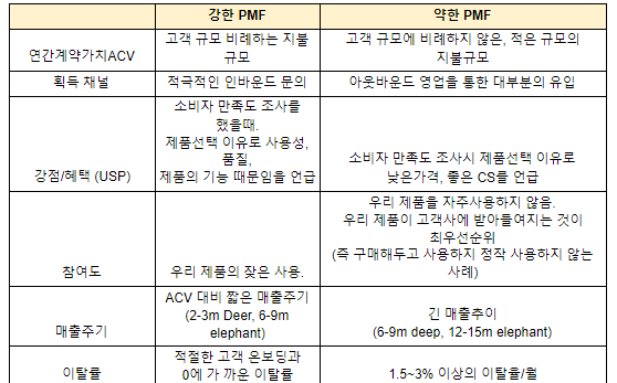 고객의 다양성(회사를 시작하기 전에는 잠재고객임을 몰랐던), 당신 고객의 비즈니스에 얼마나 핵심 역량을 제공하는지?( 만약 우리 제품이 없어진다면 얼마나 큰 타격을 받게 될지?), 이탈률, 파일럿 기간 중 고객들이 얼마나 헌신적인지?, 얼마나 바이럴 되는지?(Organic 한 유저가 많으면 많을수록 좋음).