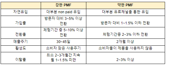 아래 예시는 SaaS 기업이 대략적으로 고객 규모 및 stage별 PMF를 측정하기 위한 기준점인데