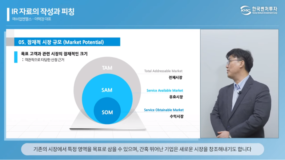 - TAM(전체 시장 )>SAM(전체 시장에서 자신의 모델이 적용되는 시장) > SOM(유효시장 내에서 1차적으로 확보 가능한 시장