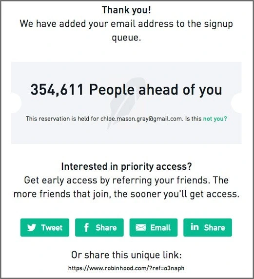 로빈후드는 바이럴 루프를 다음과 같이 만들었는데, 사용자들이 로빈후드에 가입했을 때 그들은 대기자 명단에 올라가고, 목록에서 상위 랭크될수록 빠르게 beta에 접근할 수 있게 했는데, 본인의 추천 코드/링크가 많이 공유될수록 beta앱 사용자로의 우선순위가 높아지도록 함. → A reward-based invitation to share Robinhood’s exclusive offer with others in just one click. The more a person shared, the higher waiting-list position. The higher the position, the sooner one would gain access to Robinhood. And who doesn’t want to jump ahead in the queue? and that’s what led to exponential growth.