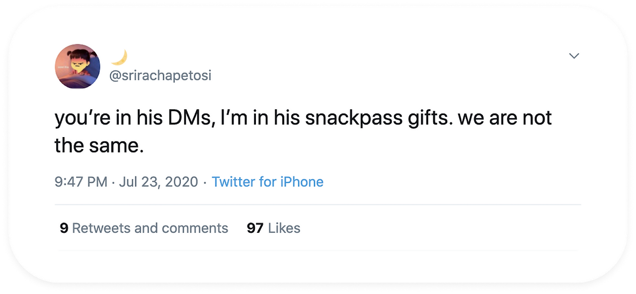 - Snackpass의 초기 성장은 이러한 다른 소셜 서비스의 시장 침투 전략과 유사한데 특정 카테고리의 인싸들에 접근해 파격적인 혜택을 제공하고> 그들이 인싸임을 인정받으며 해당서비스의 팬 겸 ambassador가 되고> 그러한 인싸들과 가까워지고 싶은 팔로워들이 유입되고> 커뮤니티가 형성되는 형태로 보이는데 이는 이전에 조사했던 모닝브루의 초기 성장전략과도 일부 유사한 것으로 보임.