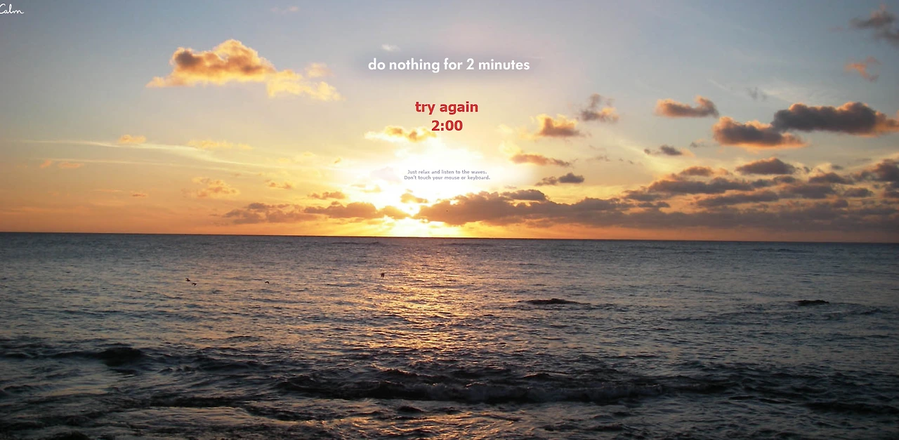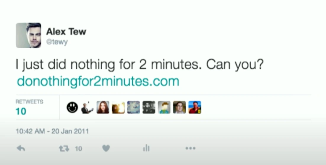 Calm이 출시되기 훨씬 전에 알렉스는 이 웹사이트를 구축했는데, 이 웹사이트에서는 사람들이 2분 동안 커서나 키보드를 움직이지 않도록 하는 서비스를 만들었음. 해당 프로덕트 또한 테크크런치&CNN을 비롯한 메인스트림 언론에 소개되었고 200만의 unique visitor를 10일 만에 유치했고, 제대로 제품이 출시하기 전에 10만 개의 이메일을 확보함.