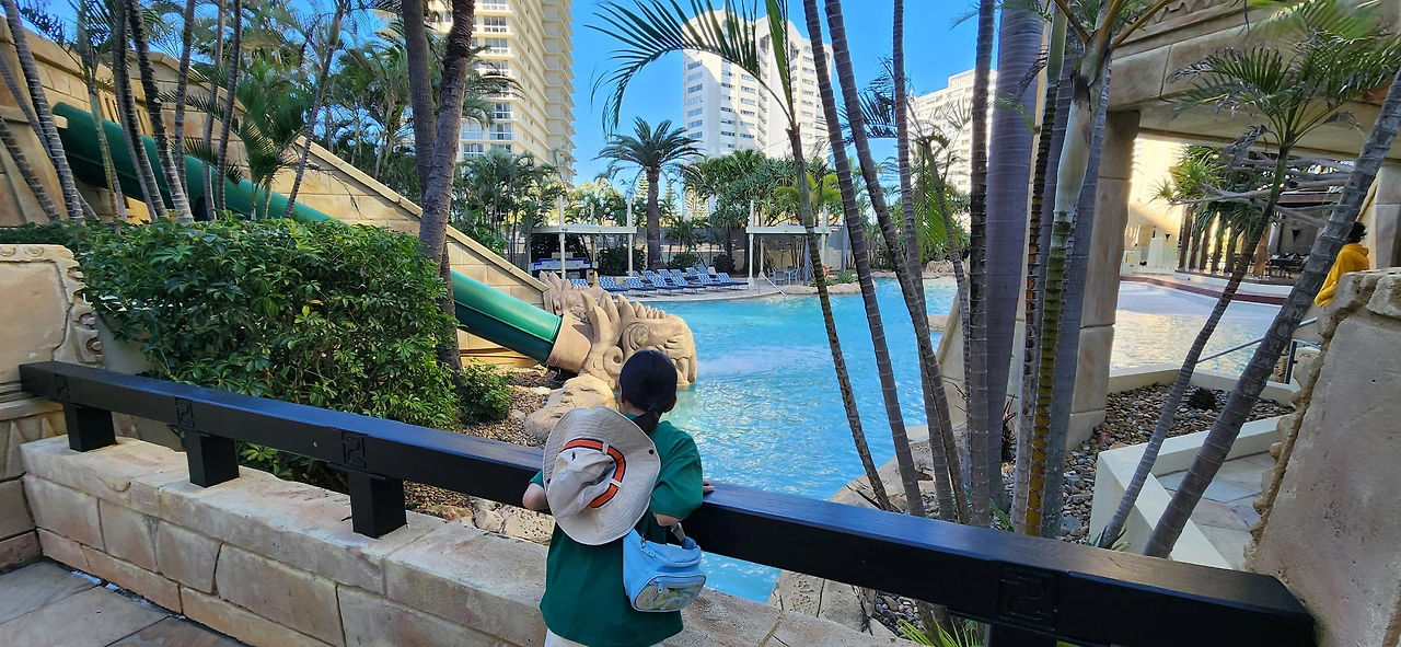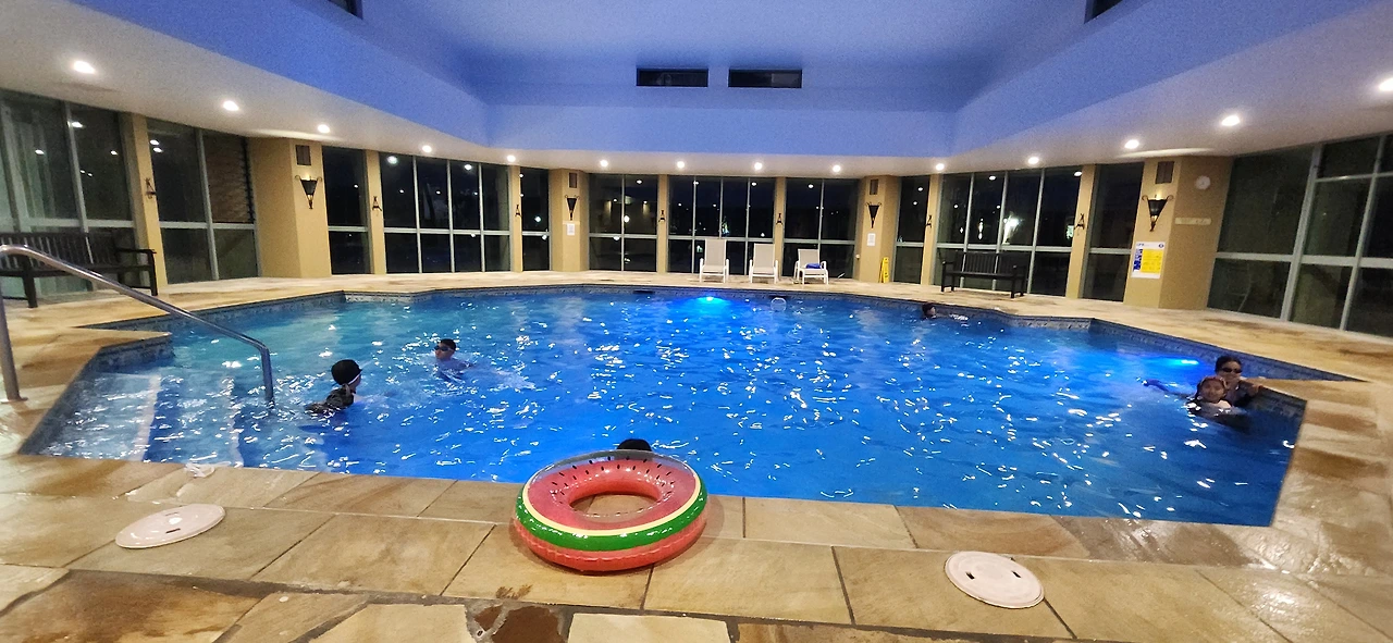 수영장은 실내 온수풀과 실외 온수풀 그리고 워터 슬라이드를 포함한 야외 풀이 있네요. 생각보다 야외 풀은 너무 차가워서 아이들이 손사래를 젓고요. 그 외 온수풀들은 들락날락하기 딱 적당한 온도라 아이들이 많이 좋아하네요. 딸아이는 아직 수영을 못해서 튜브를 가지고 왔는데, 문제는 바람 넣는 컴프레서 장비가 없어서 입으로 불던가 해야 했어요. 저는 다행히 워터가드에게 장비실에 있는 공기 내뿜는 청소기를 빌려서 바람을 넣었답니다. 입구가 너무 큰데 조그만 풍선 입구에 바람을 모아야 하고 컨트롤해야 해서 손이 좀 많이 아팠어요. 그래도 입으로 넣었으면 볼이 얼얼한 게 며칠 갔을 텐데.. 다행히 10분 만에 튜브와 볼 모두에 바람을 잘 넣었답니다.