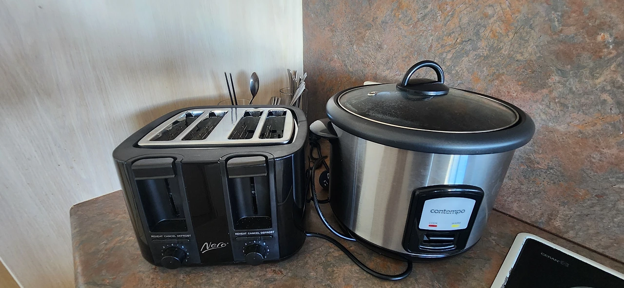 대부분의 주방 용품들은 있는 것 같아요. 다른 캠프 참여 어머니의 이야기로는 상태가 메롱 인 것도 있다고 하니 정 맘에 안 들면 바꿔달라고 해야겠지요? 그래도 프라이팬과 작은 냄비, 그리고 아주 큰 솥도 있어서 나름 편리하게 사용 중이랍니다. 도마와 칼, 빵칼도 있고 일부 집기 도구들은 대부분 다 스테인리스라서 사용이 좀.. 밥솥은 대여를 해줬어요. 한국인의 밥심을 위해 밥은 먹어야 하니까..