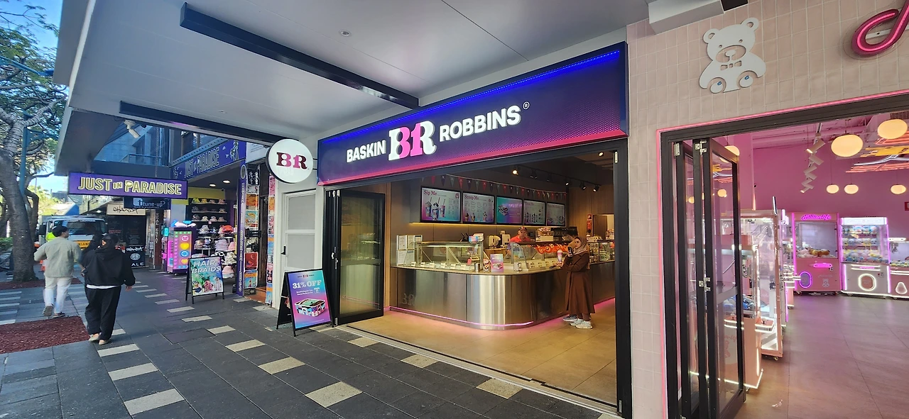 여느 바다로 향하는 길과 같지만 숙소 앞바다보다는 더 많은 사람들로 붐비고 있었어요. 뜨거운 태양을 만끽하며 잠을 청하는 사람들도 있고 한가득 짐을 싸고 움츠리고 있는 노숙자도 보이고 흔한 번화가의 모습이네요. 곳곳에 눈에 띄는 익숙한 브랜드 상점들과 한국 식당 그리고 베스킨라벤스와 공차 스타벅스도 보이네요.