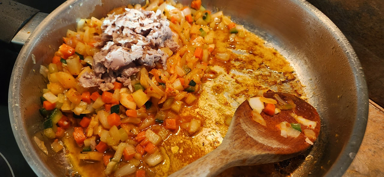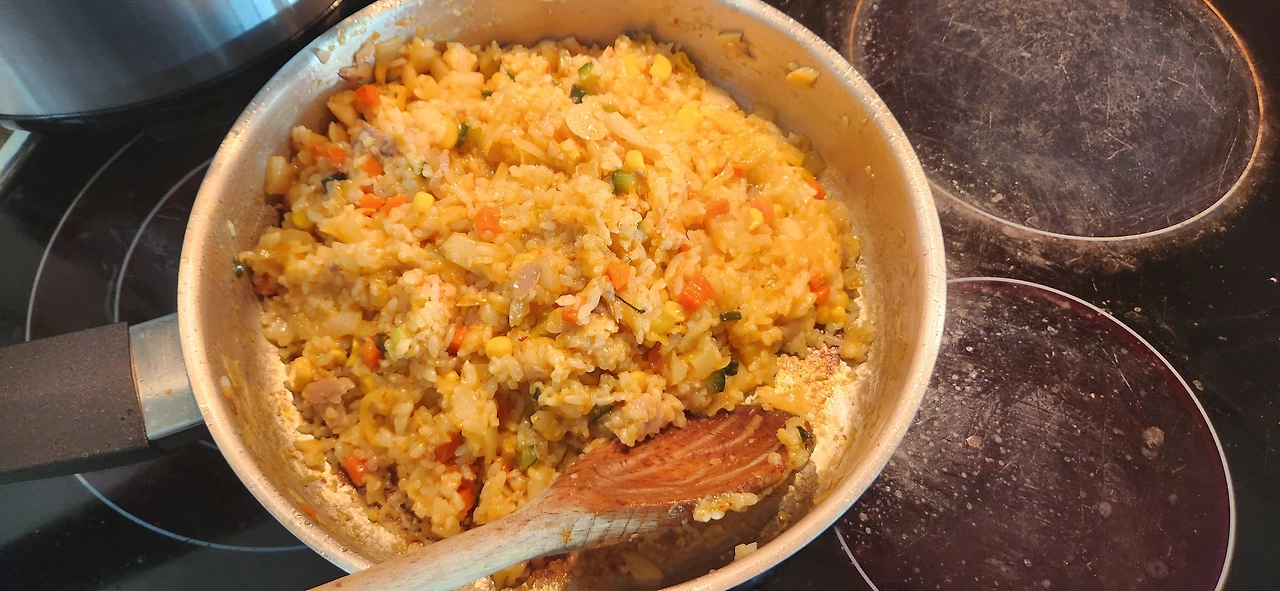 볶음밥은 간이 가장 중요한데 김치만 있다면 뭐~ 아무런 조미료도 필요 없겠죠? 갖가지 체소들을 넣고 볶다가 김치를 넣어주면 끝~~ 팁은 참치캔 하나를 통으로 넣는 거예요~^^