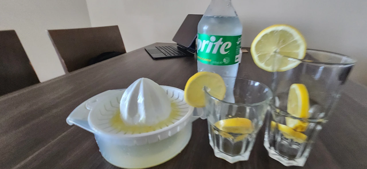 레몬을 보고 생각난 레모네이드도 쉽게 사이다와 레몬만 있으면 만들 수 있네요~ 웰컴 드링크로 딱이라 사이다를 몇 개 더 사다 놔야겠어요~^^ 레몬이 신선하고 상큼해서 저희는 좋아한답니다. 비타민도 와장창!!