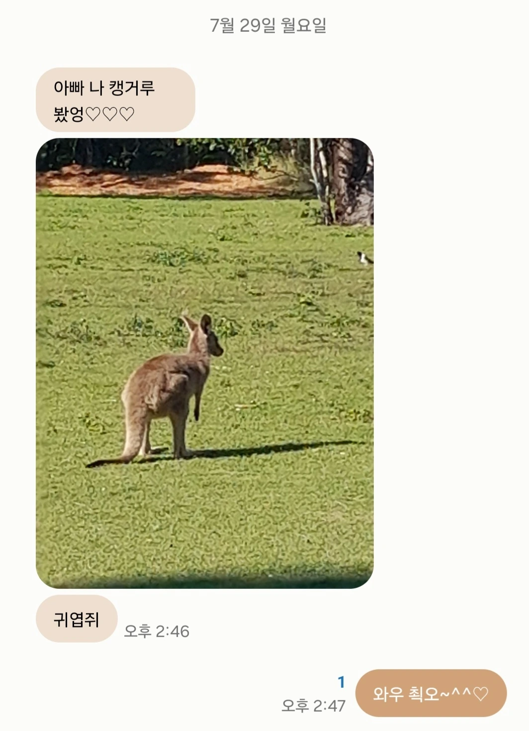 또 하루가 흘러갔고 여전히 쌀쌀한 호주에서의 겨울을 그나마 아침나절의 따스한 햇살로 위로해 본다. 무엇보다 씩씩하게 캥거루를 봤다고 사진과 메시지를 보내오는 대견한 딸아이를 위해서라도 나의 소중한 시간과 가족을 위해서라도 적당히 또 여유룰 찾아보려 한다. 미더워도 부족해도 그저 내버려 두자.