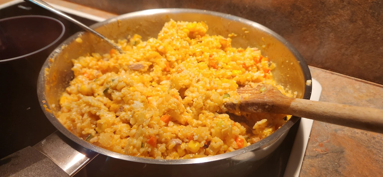 우리에게는 주어진 몇 가지 옵션 밖에 없었다. 몇 가지는 도전적인 식료품들.. 그래도 생각보다 어제 도전한 참치캔이 늘 먹던 맛과 비슷했고, 도시락을 위해 준비해 두었던 어제 마트 장보기 아이템들을 골라 볶음밥을 하기로 했다. 주는 감자와 당근, 양파와 무엇보다 맛있는 한국식 신김치(하나로마트 제공)였다. 다행히 맛이든 신김치는 맵지 않아 아이가 스스로 김치볶음밥을 해달라고 했으니 크게 걱정은 없었다. 색감을 위해 즐겨 먹지 않는 껍질이 두꺼운 오이도 준비해 두었기에 조금 추가했다. 어제 보충했던 스위트 콘도 곁들이니 나름 그럴싸했다. 참치 액젓 대신에 참치캔의 양념이 커버를 해주고 김이 간을 조금 보저하고 정 싱거우면 소금과 후추가 조금 보완했다. 그렇게 볶음밥을 힘겹게 끝내고 나니 이제는 삼각김밥의 소가 문제였다.
