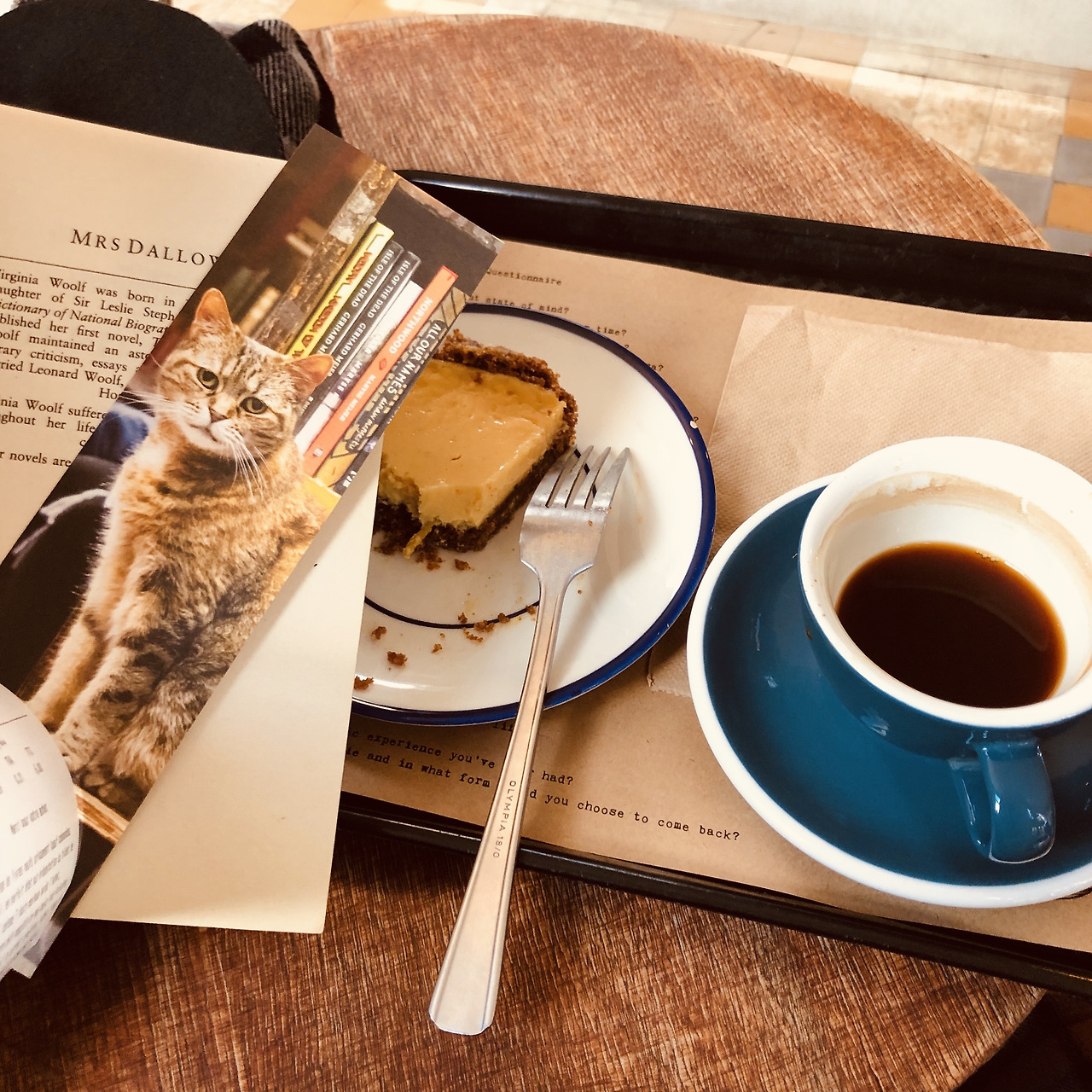 서점 옆에는 마찬가지로 셰익스피어 앤 컴퍼니에서 운영하는 카페가 하나 있다. 점심을 먹은 후인데도 단 게 땡겨 치즈케익 한 조각과 커피 한 잔을 사서 자리에 앉았다. 뭘 했는지 잘은 기억 안 나는데, 산 책을 조금 읽었던가 폰으로 이 다음엔 어디에 갈지 검색을 해봤던가 그랬던 것 같다. 커피 트레이에는 생각해 볼 만한 질문이 잔뜩 적힌 종이가 깔려 나왔다. 200n년, 201n년에 '커뮤'를 뛰던 블로거들 사이에 돌던 n제나 ㅇㅇ문답 같은 느낌인데, 대부분의 질문이 독서인으로서의 인생에 관련된 것이다. 이것 역시 여행 중 한번쯤 심심할 때 써봐야지, 하고 노트에 넣고 다녔는데 정작 써먹은 건 1년이 지나 친구네 집에서 술을 마시면서였다.