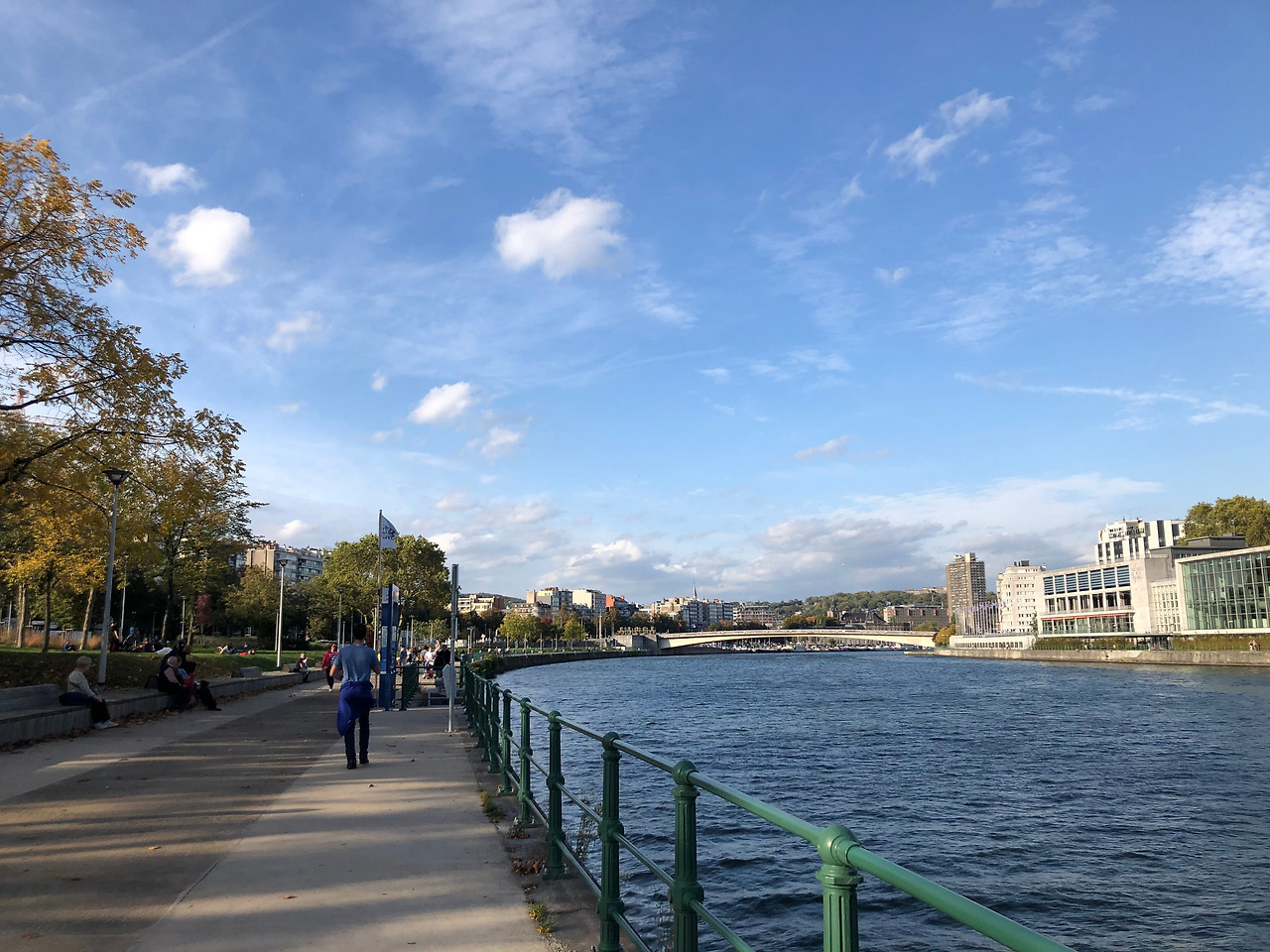 탑승시간까지 간발의 차를 두고 환승 플랫폼에 도착했지만 늘 그렇듯 유럽의 기차는 연착을 반복하고. 20분이 지나서야 열차가 왔다. 2시간을 더 달려 도착한 세 번째 환승지는 벨기에 동쪽 끝에 붙은 리에주Liege의 Liège-Guillemins역. 역 건물부터 크고 새로 지은 티가 팍팍 나는데, 둘러 보니 도시 전체가 현대적인 느낌을 물씬 풍긴다. 강변에 거대한 함선처럼 생긴 높은 통유리 건물(검색해보니 세무서라고 한다)이 보이는 것도 한몫 한다. 서유럽의 도시들은 하나같이 낡은 줄로만 알았는데 예상 외다. 캐리어를 끌고 강변으로 나가 잘 정비된 산책로를 걷는다. 역시나 보기 드문 동양인 여자에게 주민들의 시선이 몰려들지만 여행지에서라면 이 정도는 별 생각 없이 넘길 수 있다. 강물은 폭이 넓고 햇살 아래 짙은 푸른색으로 넘실거린다. 강아지를 데리고 산책을 나온 가족이 여럿 보인다. 평화롭다.