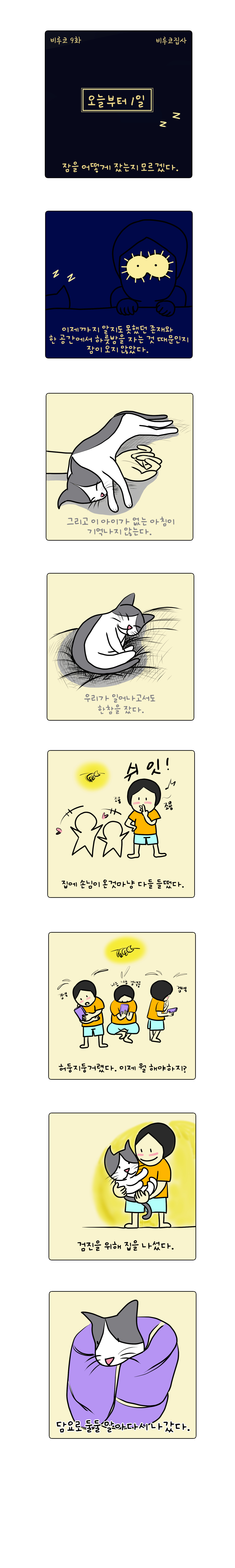 이 작은 고양이의 숨소리 하나가 이렇게 크게 들리다니... 잠이 올 수가 없다.