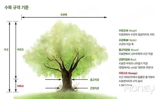 나무의 높이를 수고라고 하고, 나무의 폭을 수관폭이라고 합니다. 그리고 가슴높이에서 잰 줄기의 두께를 흉고직경(DBH, Diameter of Breast Height)이라고 합니다. 나무는 수관폭, 수관고 및 흉고직경 모두가 균형을 맞추어 자라야지 좋은 나무라 할 수 있습니다. 흉고직경은 얇은 데 수관고만 높게 자라는 나무는 비바람에 쉽게 흔들릴 수 밖에 없습니다.