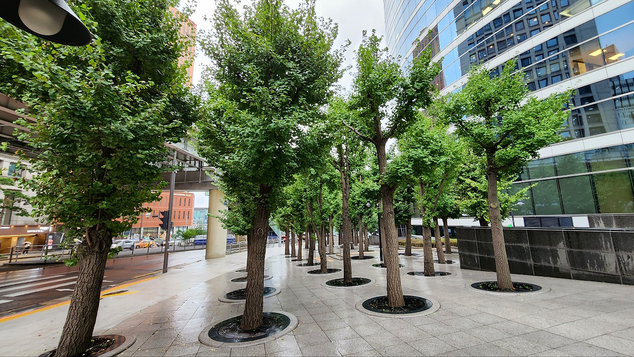서울역 앞에는 <서울빌딩(옛날 대우빌딩)>이 있습니다. 회사 일 때문에 이 근처를 걷다가 OO빌딩 앞을 지나게 되었습니다. OO빌딩 앞에는 건물 3층 정도 높이의 은행나무 30그루 정도가 자리를 지키고 있습니다. 올해 3월경 갔을 때는 가지만 있는 남은 채 너무 빽빽하게 자라고 있는 은행나무들이 짠했습니다. 8월에 다시 찾아갔을 때는 은행나무들이 녹음을 머금고 있었습니다.