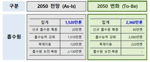 여기서 주목할 것은 신규로 나무를 심는 ‘신규 흡수원 확충’(신규조림) 보다 ‘흡수능력 강화’가 훨씬 온실가스 흡수량의 규모가 크다는 것입니다.