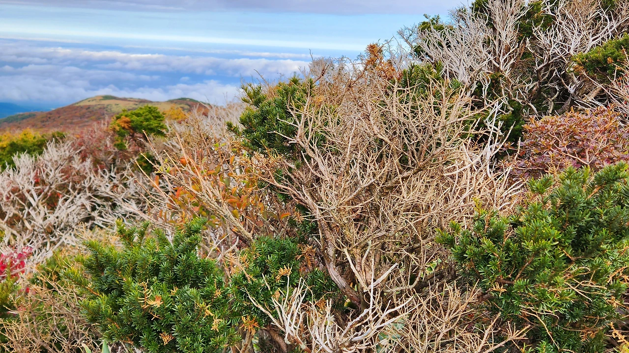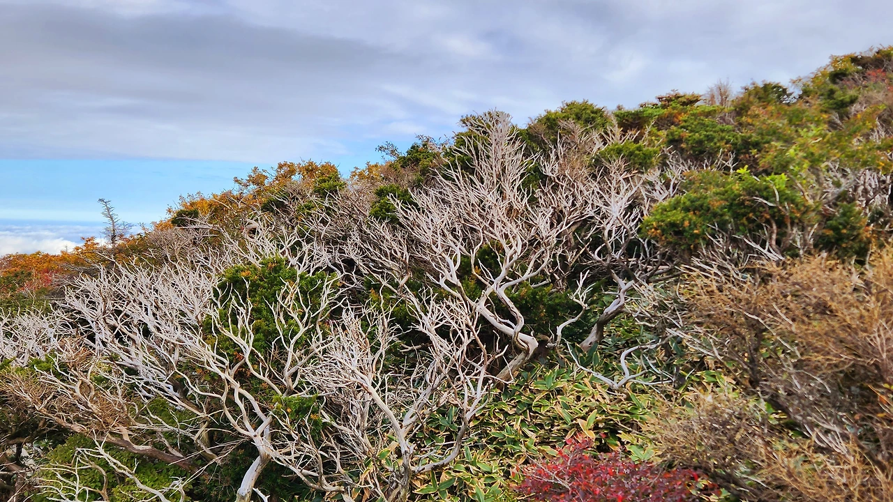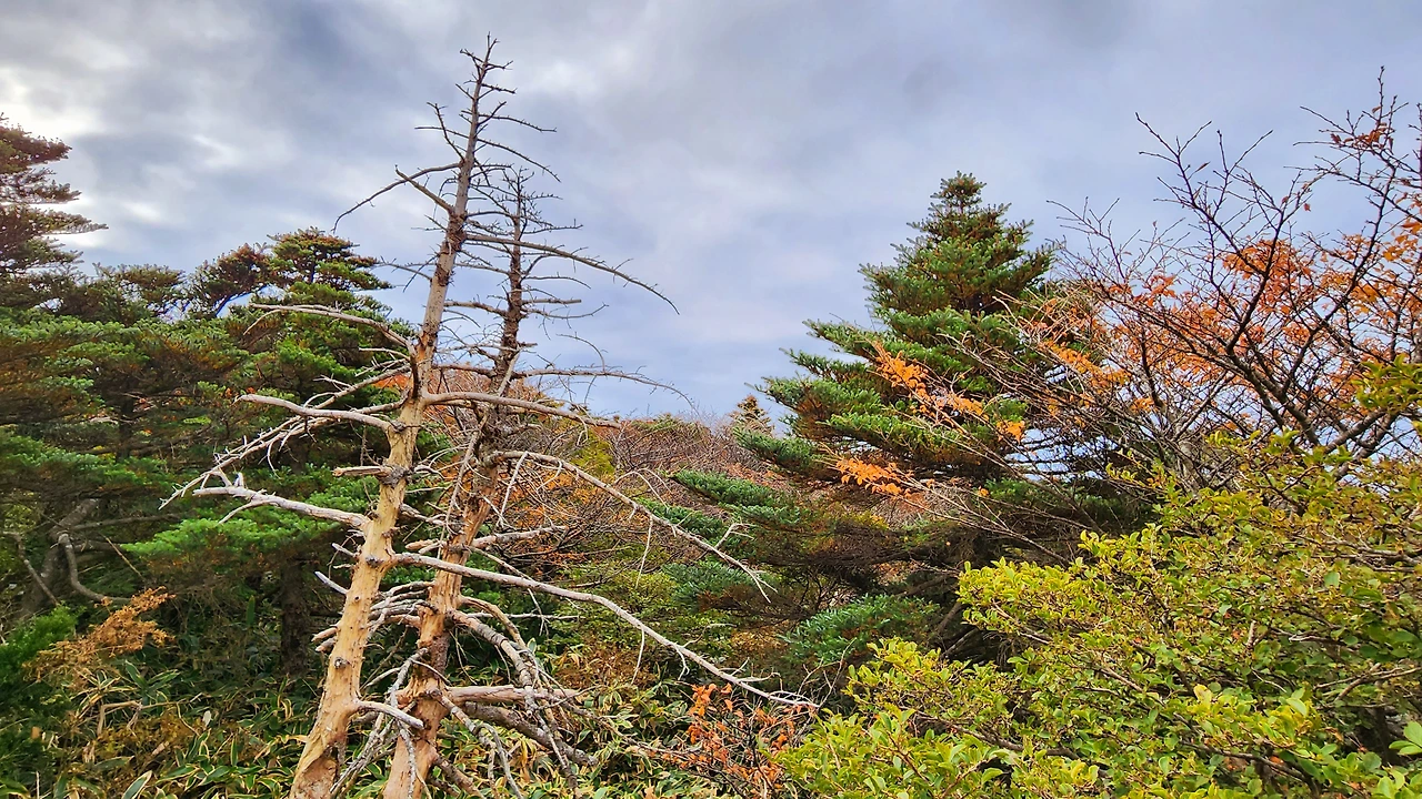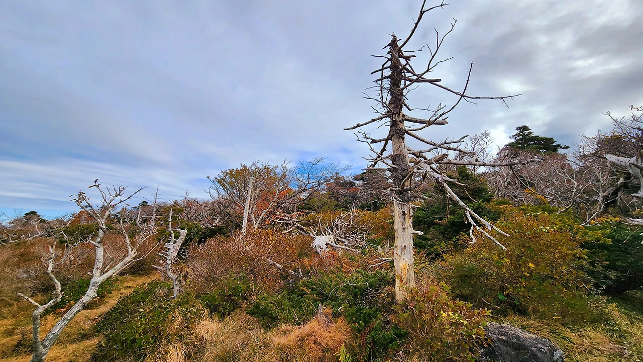 한 시간 정도 산행 후 해발 1,600m 고지에 도착했습니다. 여기에는 구상나무 군락지가 있습니다. 그리고 그곳엔 지구온난화와 기후변화의 슬픈 증거인 구상나무 고사목이 기다리고 있었습니다.