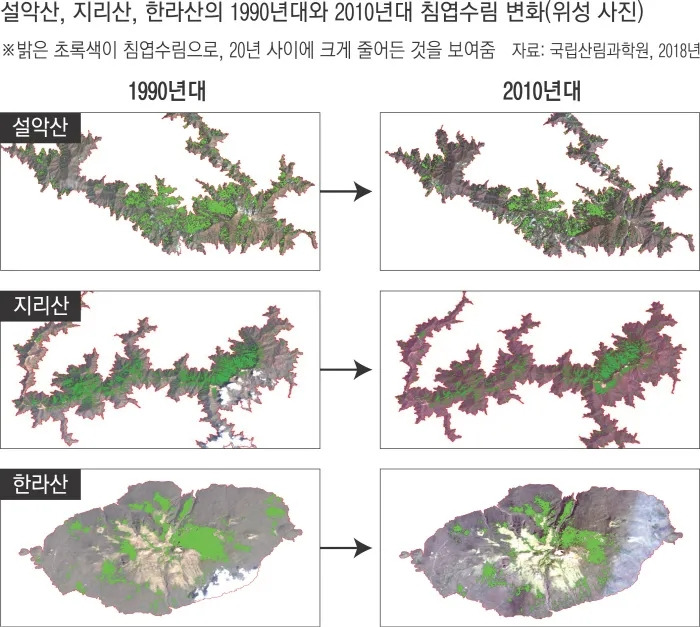 우리나라 전역 고산지대에는 가문비나무, 구상나무와 같은 침엽수들이 살고 있습니다. 이들이 생존하는 조건은 고산지대라 평지보다는 더욱 추운 조건입니다. 일반적으로 고도가 100m 올라갈 때마다 평균온도가 1℃ 씩 낮아집니다. 그런데 지구온난화로 고산지대 침엽수들의 서식지가 따뜻해지고 있습니다.
