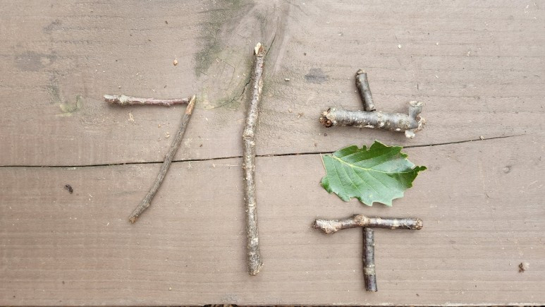 스탬프를 열심히 찍고 도착한 곳에는 캠핑러를 위한 데크도 존재하고 좀 더 깊이 들어가니 <유아 숲 체험장>에 도착했습니다. 한참을 걸려 도착했으나 아쉽게도 유지보수 공사 중이라 아이들이 놀지는 못했습니다. 그나마 떨어진 나뭇잎과 나뭇가지를 이용하여 글자 만들기 놀이를 하였습니다. 첫째는 아빠, 엄마 이름도 쓰고, 둘째는 본인 이름과 친구 이름도 쓰기도 하였습니다. 그러다 첫째가 아빠가 나무에 대해서 열심히 설명해 준 덕분인지, 아니면 아빠가 하고 있는 일을 알고 있다고 알려주고 싶었는지, ‘기후’라는 말도 써줬습니다. 기특하여 사진으로 남겼습니다.