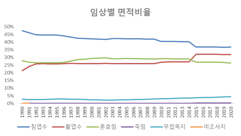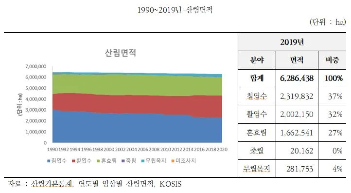 2019년 기준 우리나라의 산림면적은 629만ha입니다. 이 중 소나무로 대표되는 침엽수림의 면적인 232만ha로 우리나라 산림의 37%를 차지합니다. 참나무류(굴참나무, 졸참나무, 상수리나무, 떡갈나무, 신갈나무)로 대표되는 활엽수림의 면적이 200만ha로 우리나라 산림의 32%를 차지합니다. 그리고 침엽수와 활엽수가 섞여 있는 혼효림이 166만ha로 우리나라 산림의 27%를 차지합니다.