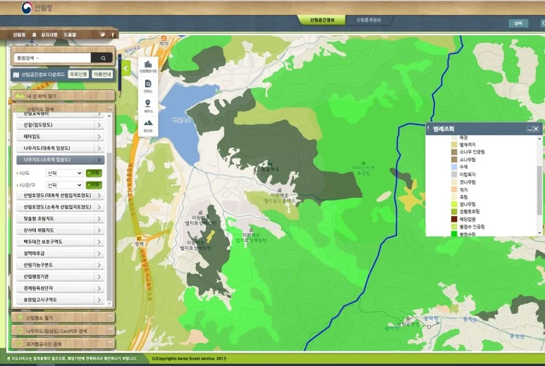 이번에 다녀온 바라산 자연휴양림은 낙엽송과 활엽수림이 분포하고 있습니다. 산림청에서는 산림공간정보서비스(https://www.forest.go.kr)를 통해 등산로, 유아 숲 체험 장소, 나무지도(임상도), 토양도에 대한 정보를 제공하고 있습니다. 원하시는 지역을 선택하시면 아래와 같은 임상도를 찾아보실 수 있습니다.