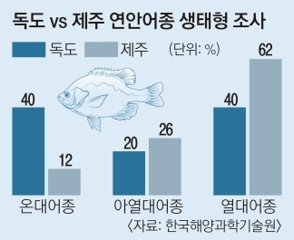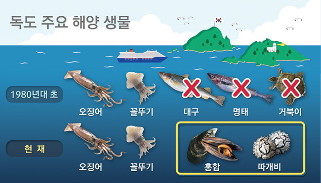 반면 현재 독도의 해양에는 난류성 어종인 대구와 명태가 사라졌습니다. 그리고 그 자리에는 홍합이나 따개비와 같은 생물이 차지했습니다. 또한, 제주도 주변에서 관찰되던 파랑돔, 자리돔, 청황베도라치와 같은 ’아열대‘ 어종이 차지하고 있습니다.