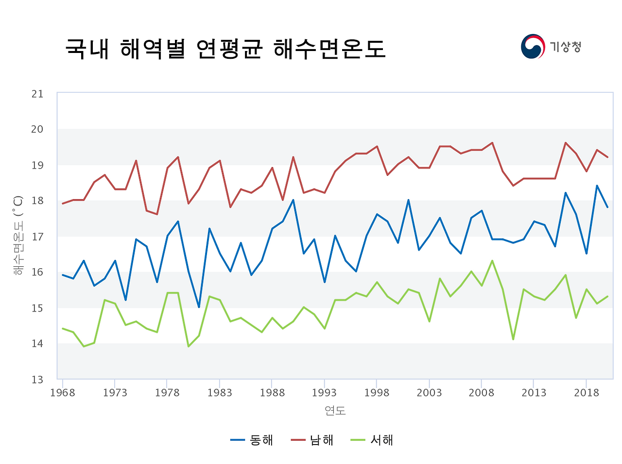 지표면 평균기온이 상승하는 만큼 그 영향을 받아 해수면 온도도 지속적으로 상승하고 있습니다. 동해의 수온은 지난 50여 년 동안 약 1.7도 정도 상승했다고 합니다.