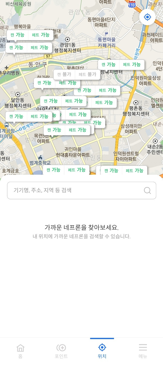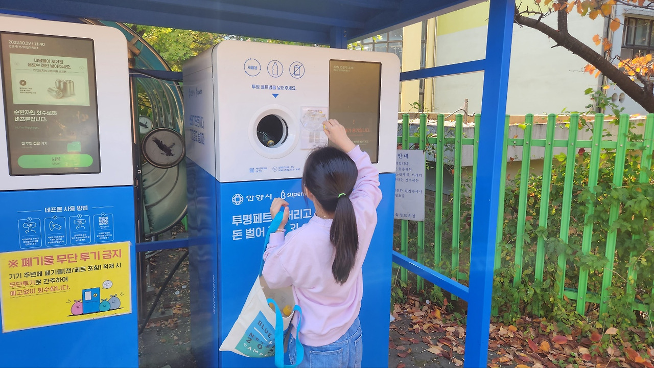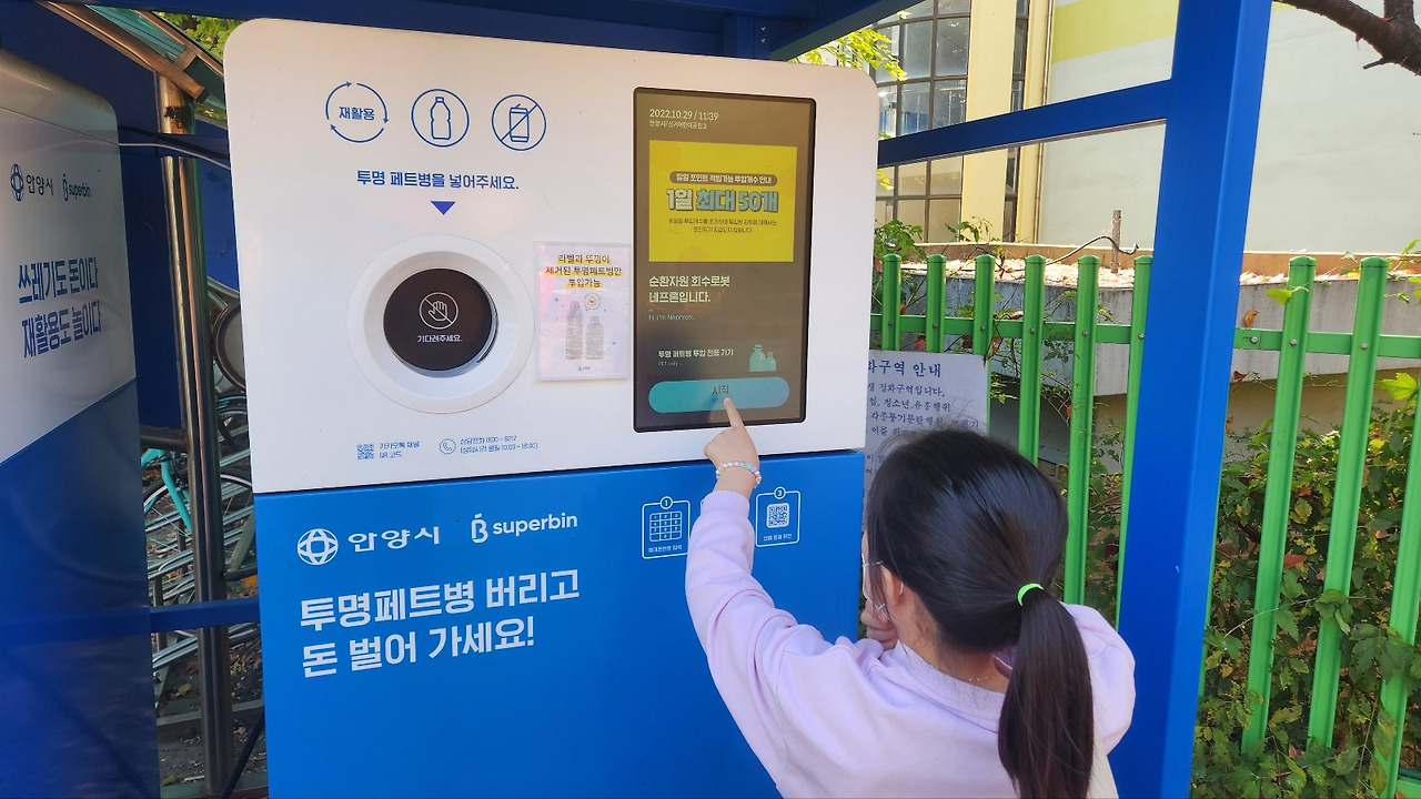 제가 사는 안양시에는 슈퍼빈이라는 AI 기반 자원회수기기 ‘네프론’을 설치했습니다. 안양의 총 15개소 캔과 투명페트병을 회수하는 기기 50대를 설치했습니다. 회수율을 높이기 위해서 안양시 곳곳에 사람들이 많이 다니는 곳에 설치했으며, 캔과 투명페트병 1개당 10포인트를 지급합니다.