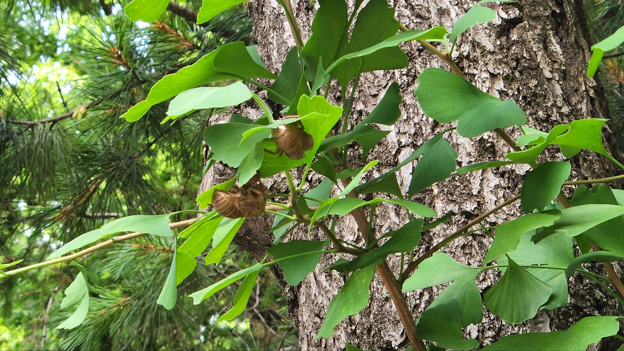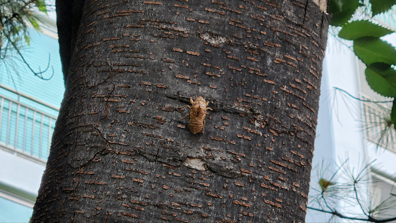 아이들과 같이 매미소리가 나는 곳을 찾아가 보니 나무 줄기와 잎에는 매미가 탈피하고 나간 매미 껍질(선퇴)이 붙어있었습니다.