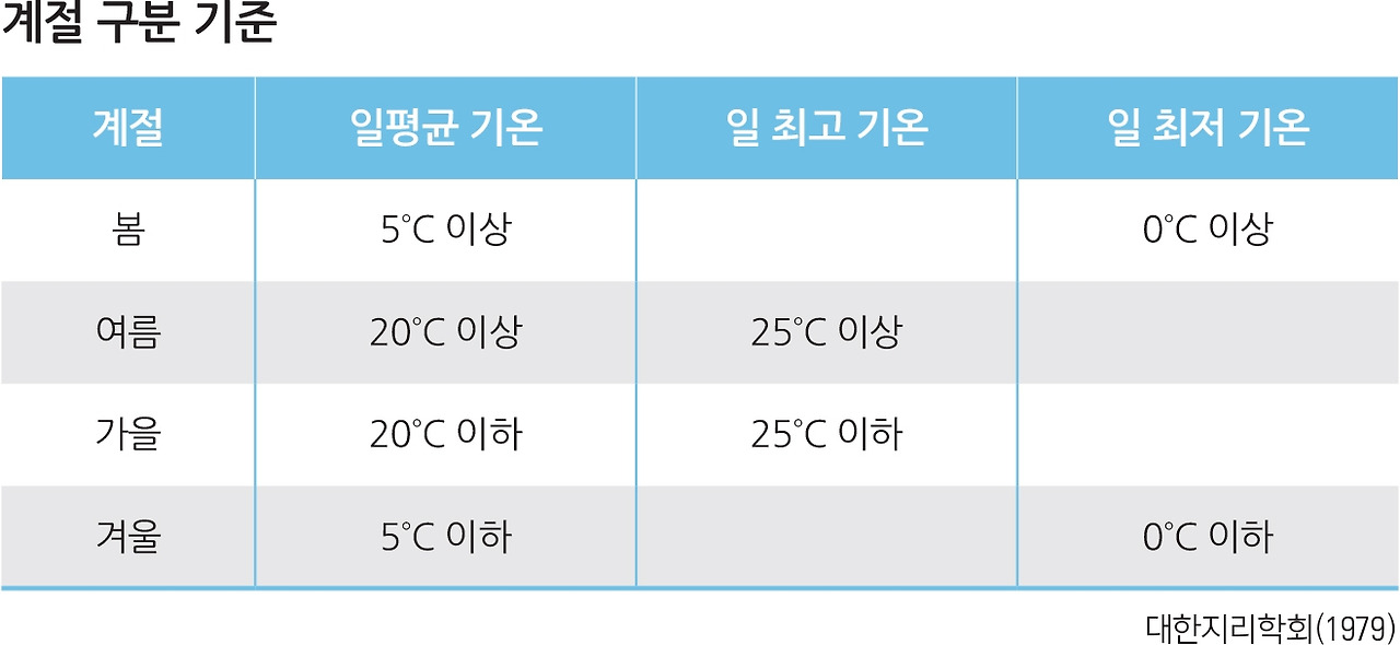 기상청은 좀 더 복잡하게 계절을 구분합니다. 기상청은 일평균기온 5℃와 20℃ 기준에 따라 사계절을 구분하고 있습니다.