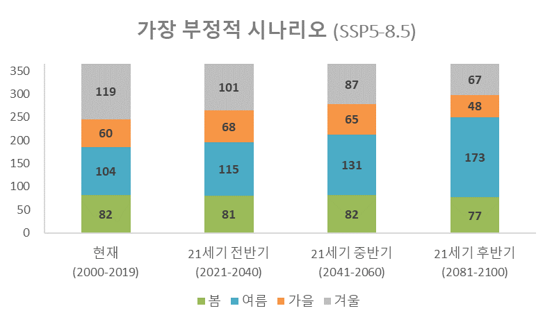 가장 긍정적 시나리오(SSP1-2.6)에서도 여름은 현재 104일에서, 21세기 후반(2081~2100)에는 129일까지 증가합니다. 가장 부정적 시나리오(SSP5-8.5)에서는 여름은 현재 104일에서 173일로 급증하는데, 이는 1년 중 47%가 여름이라는 것입니다.