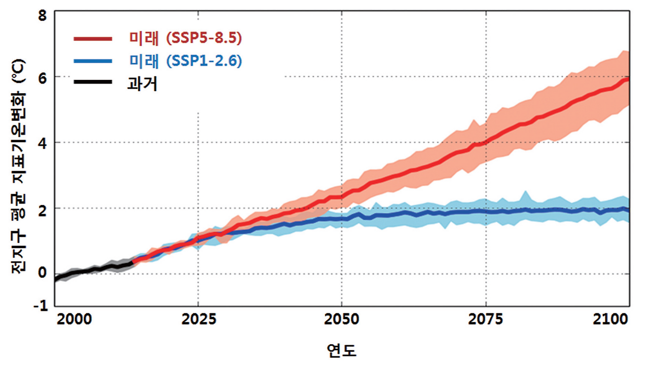 대표적인 기후시나리오 중 하나는 SSP1-2.6 시나리오로 ‘재생에너지 기술 발달로 화석연료 사용이 최소화되고 친환경적인 지속가능한 경제성장을 가정’한 것으로, 가장 긍정적 시나리오입니다. 다른 하나는 SSP5-8.5 시나리오로 ‘산업기술의 빠른 발전에 중심을 두어 화석연료 사용이 높고 도시 위주의 무분별한 개발 확대를 가정’한 것으로, 가장 부정적 시나리오입니다.