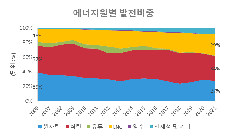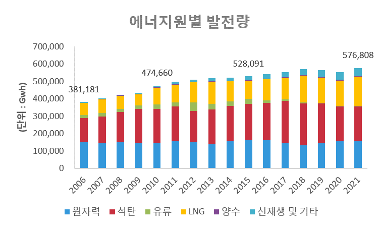 예를 들어 <에너지원별 발전량> 통계를 살펴보겠습니다. 2006년 381,181Gwh 수준이던 발전량이 2020년에는 552,162Gwh로 51% 정도 증가했습니다. 동일기간에 석탄발전의 비중이 37%에서 34%로 떨어졌으며, 유류발전은 5%에서 1%로 떨어졌습니다. 반면 저탄소 혹은 무탄소라 불리는 원자력발전은 39%에서 27%로 감소, 신재생에너지는 1%에서 8% 증가했습니다.